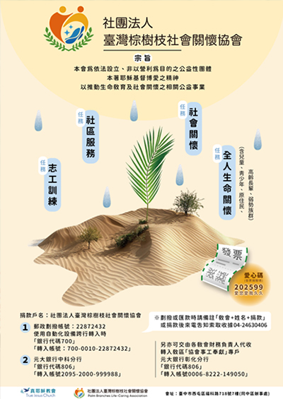 協會成立—宗旨與服務,歡迎踴躍捐款,以推動事工,服務社會,關心您我。